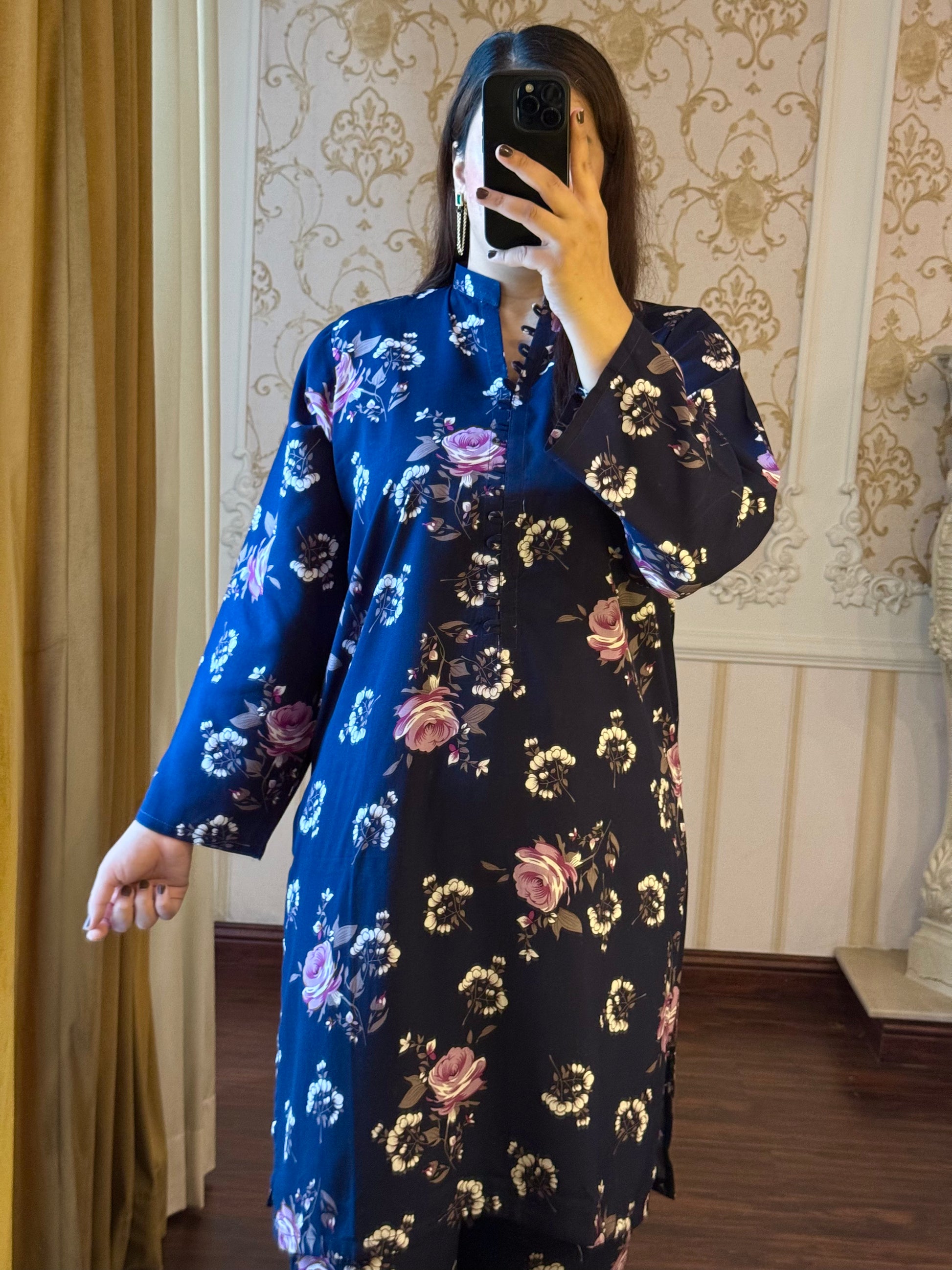 Crafted from premium Linenfabric, this beautifully printed shirt features intricate detailing on the neckline and sleeves. Delicate Hand-made Loop embellishments on the neckline add a touch of sophistication,modern finish. The straight-fit trouser is tailored from matching premium Linen fabric with coordinated prints, offering both comfort and elegance for everyday wear or casual gatherings.